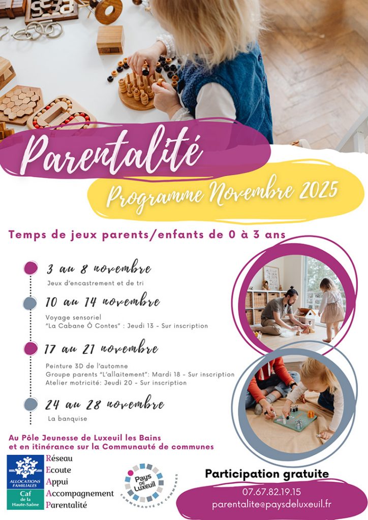 Le service parentalité œuvre en cohésion avec le Relais Petite Enfance et les crèches de la Communauté de communes du Pays de Luxeuil. La collaboration avec des intervenants extérieurs permet d’offrir aux usagers des temps originaux et de qualité.