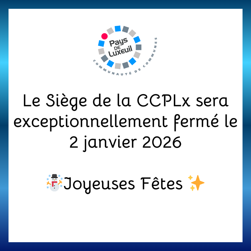 - Fermeture du Siège de la CCPLx le 2 janvier 2026Fermeture exceptionnelle du Siège le 2 janvier 2026 Le Siège de la CCPLx, 22 rue Jules Jenneney à Luxeuil-Les-Bains sera exceptionnellement fermé le vendredi 2 janvier 2026. Joyeuses Fêtes !