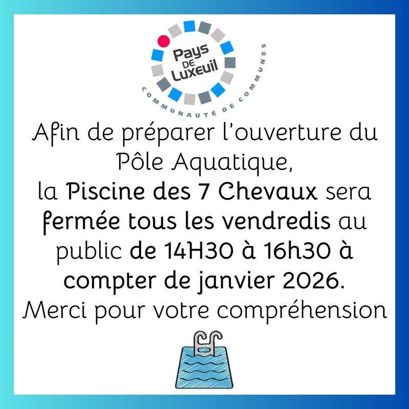 - Changements horaires Piscine des 7 Chevaux à compter de janvier 2026Les horaires de la Piscine des 7 Chevaux changent les vendredi à compter de janvier 2026 Afin de préparer l’ouverture du Pôle Aquatique,la Piscine des 7 Chevaux sera fermée tous les vendredis au public de 14H30 à 16h30 à compter de janvier 2026. Les animations du soir seront assurées. Merci pour votre compréhension