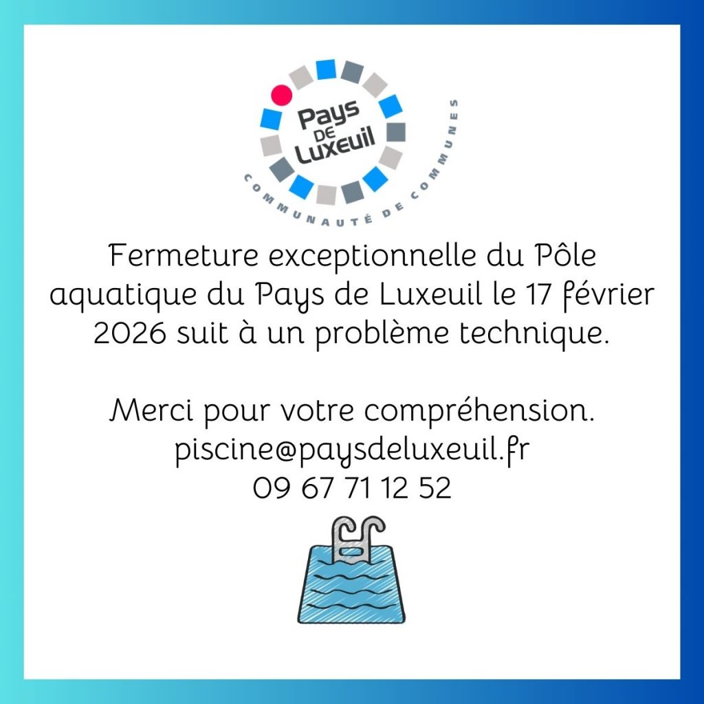 - Fermeture exceptionnelle du Pôle aquatique le 17 février 2026Fermeture exceptionnelle du Pôle aquatique du Pays de Luxeuil le mardi 17 février 2026 suite à un problème technique. Merci pour votre compréhension.