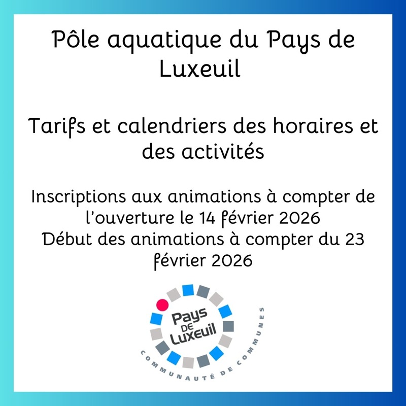 - Portes ouvertes du Pôle aquatique le 7 février 2026Le nouveau Pôle aquatique intercommunal ouvre ses portes Portes ouvertes du Pôle aquatique le samedi 7 février de 14h30 à 17h00 Av.Guynemer 70300 Luxeuil-Les-Bains (juste à côté de la piscine des 7 Chevaux). Venez nombreux !