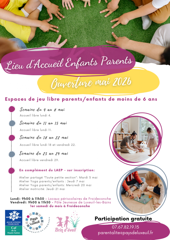 - Lieu d’Accueil Enfants Parents – programme de Mai 2026Le Lieu d’Accueil Enfants Parents de la CCPLx vous accueille tout au long du mois de mai. Renseignements via l’adresse parentalite@paysdeluxeuil.fr ou par téléphone/SMS au 07.67.82.19.15.