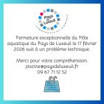 Fermeture exceptionnelle du Pôle aquatique du Pays de Luxeuil le mardi 17 février 2026 suite à un problème technique.
