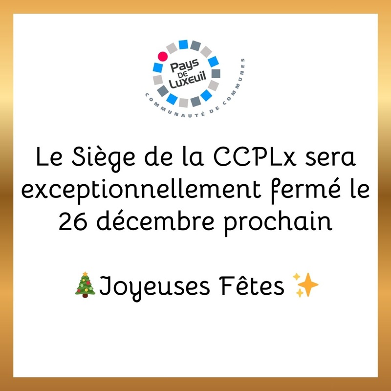 Le Siège de la CCPLx, 22 rue Jules Jenneney à Luxeuil-Les-Bains sera exceptionnellement fermé le vendredi 26 décembre 2025.