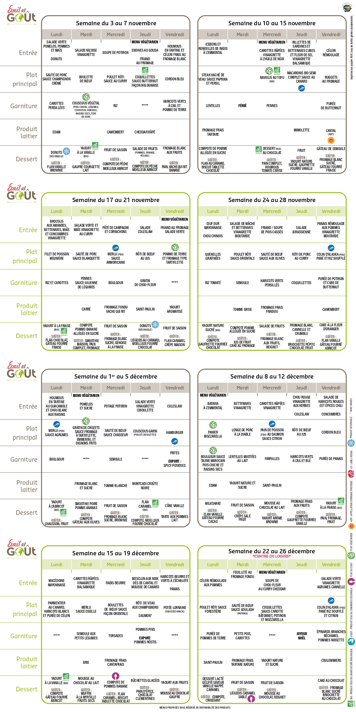 Menus de la cuisine centrale