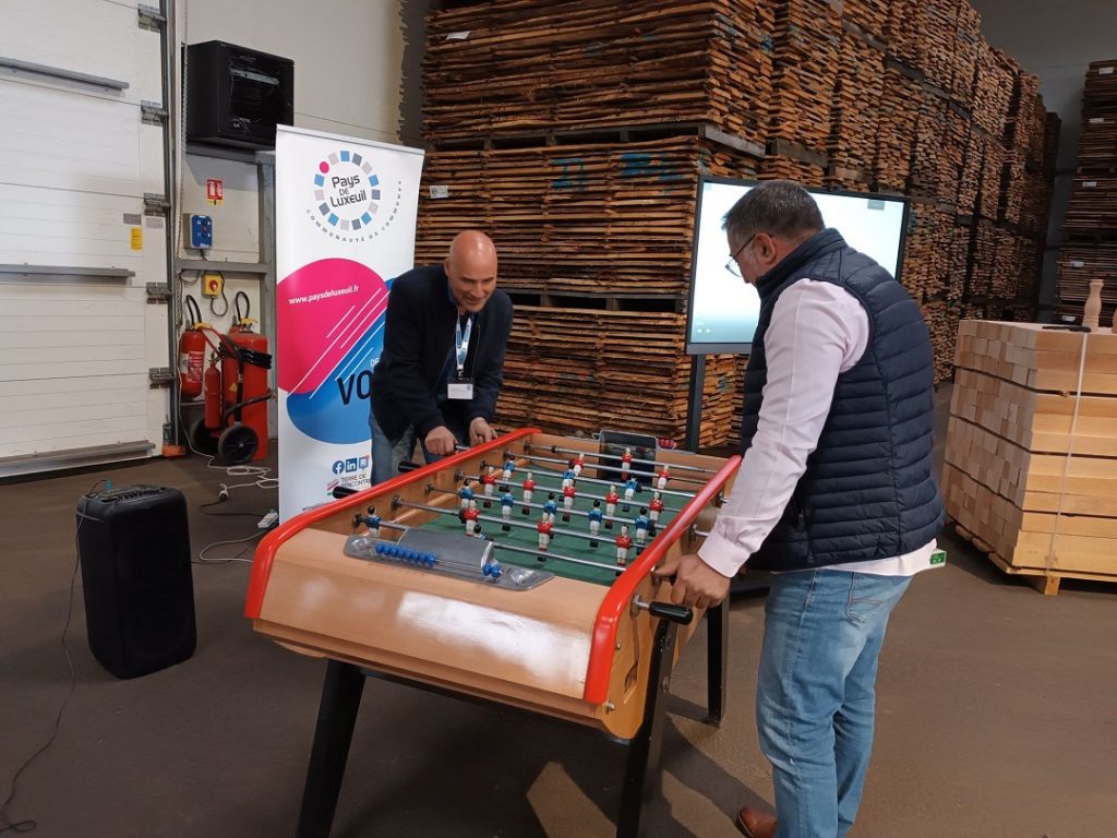 Rendez-vous annuel d’importance pour les acteurs économiques de notre territoire, l’apéro-business organisé par la Communauté de Communes du Pays de Luxeuil en partenariat avec la CCI Saône-Doubs le 12 septembre 2024 a été un franc succès avec la présence de 48 entreprises. Merci à M. Klotz et à son équipe pour leur accueil à la Scierie Genêt installée sur notre zone des Athelots. Tout y était : un décor représentant les produits de la scierie (différentes sortes du bois transformé à l’origine de la fabrication de moulin à poivre, babyfoot avec lequel les entrepreneurs ont pris grand plaisir à jouer, … ). Un rendez-vous largement apprécié avec ce nouveau format mixte : visite d’entreprise et speed meeting permettant des échanges décontractés entre les entrepreneurs et les Elus.