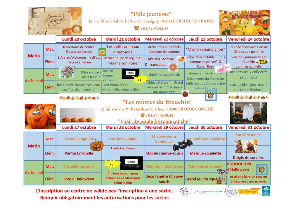 Pôle éducatif de Luxeuil « Pôle Jeunesse »15, Rue Maréchal de Lattre de Tassigny 70300 LUXEUIL LES BAINS Tel : 03.84.93.94.38 Directrice : Sandrine Ougier pole.enfance.acsl@gmail.comPremière semaine de vacances scolaires : du 23 au 27 octobre